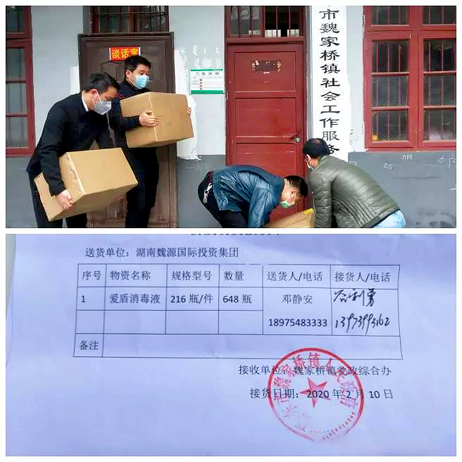 (2020年2月10日,魏源集团旗下邵东”魏源.紫云府项目”捐赠的“爱盾免洗除菌液”送达魏家桥镇防疫指挥部)